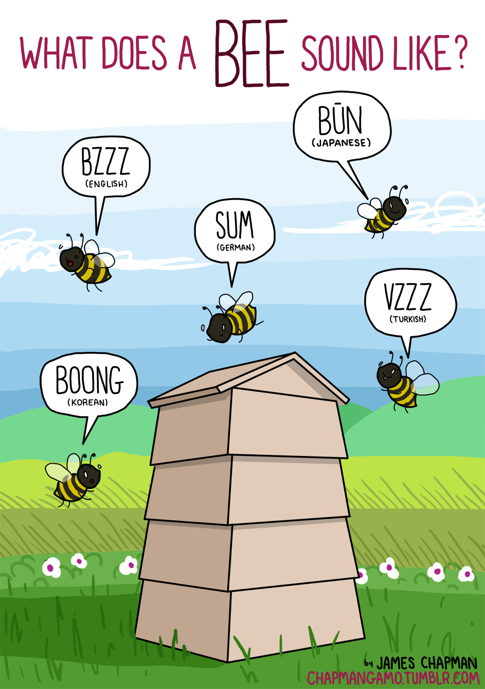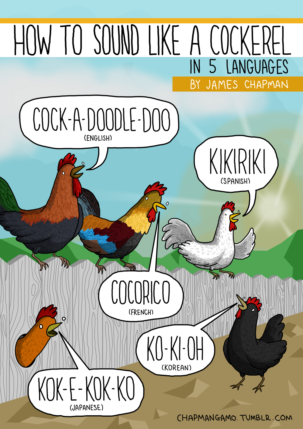 O ilustrador e físico inglês James Chapman levou a sério esse assunto e decidiu estudar como os sons que os animais emitem são simbolizados em diferentes idiomas. E as diferenças são impressionantes. Enquanto nós achamos que o cachorro faz “au au ” os russo acreditam que eles fazem ” Gav ” e os koreanos “Meong”.