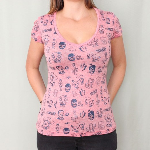 Para a estampa corrida de ” Mucho Nachos” que foi impressa na modelagem feminina, masculina e em mini-carteira, Cash nos emprestou seu trabalho de conclusão de curso de curso que tinha como tema um fast food mexicano. ” Acho o universo cultural mexicano bem interessante por ser irreverente, ter cores fortes e vários ornamentos. Então essa estampa é resultado de uma pattern(padrão repetitivo) criado para um dos materiais do fast food “Muy Nacho Muchacho”. Nessa ilustração tentei sintetizar ao máximo todos os elementos fortes da cultura mexicana e representa-los de forma bem simples, como se fossem “carimbos” da época.”