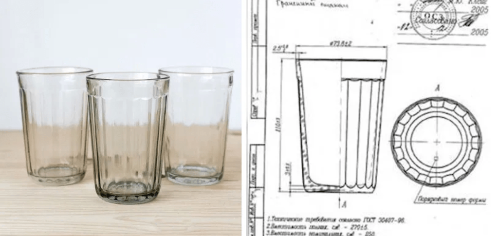 7 – Nos Estados Unidos ele é muito semelhante ao soviet glass (copo soviético), que possui design criado pela primeira-dama da escultura soviética Vera Mukhina (1889-1953). Durante a Segunda Guerra, Vera projetou no Ateliê de Vidro Artístico de Leningrado o ‘granyonyi stakan‘ [copo lapidado, canelado ou facetado] que, fabricado em Gus Khrustalny, se tornaria um ícone do design daquele país por décadas. O grosso e resistente copo teria sido criado para caber nas máquinas de lavar louça então fabricadas pelos comunistas – e se tornaria o preferido dos apreciadores de vodka da União Soviética.