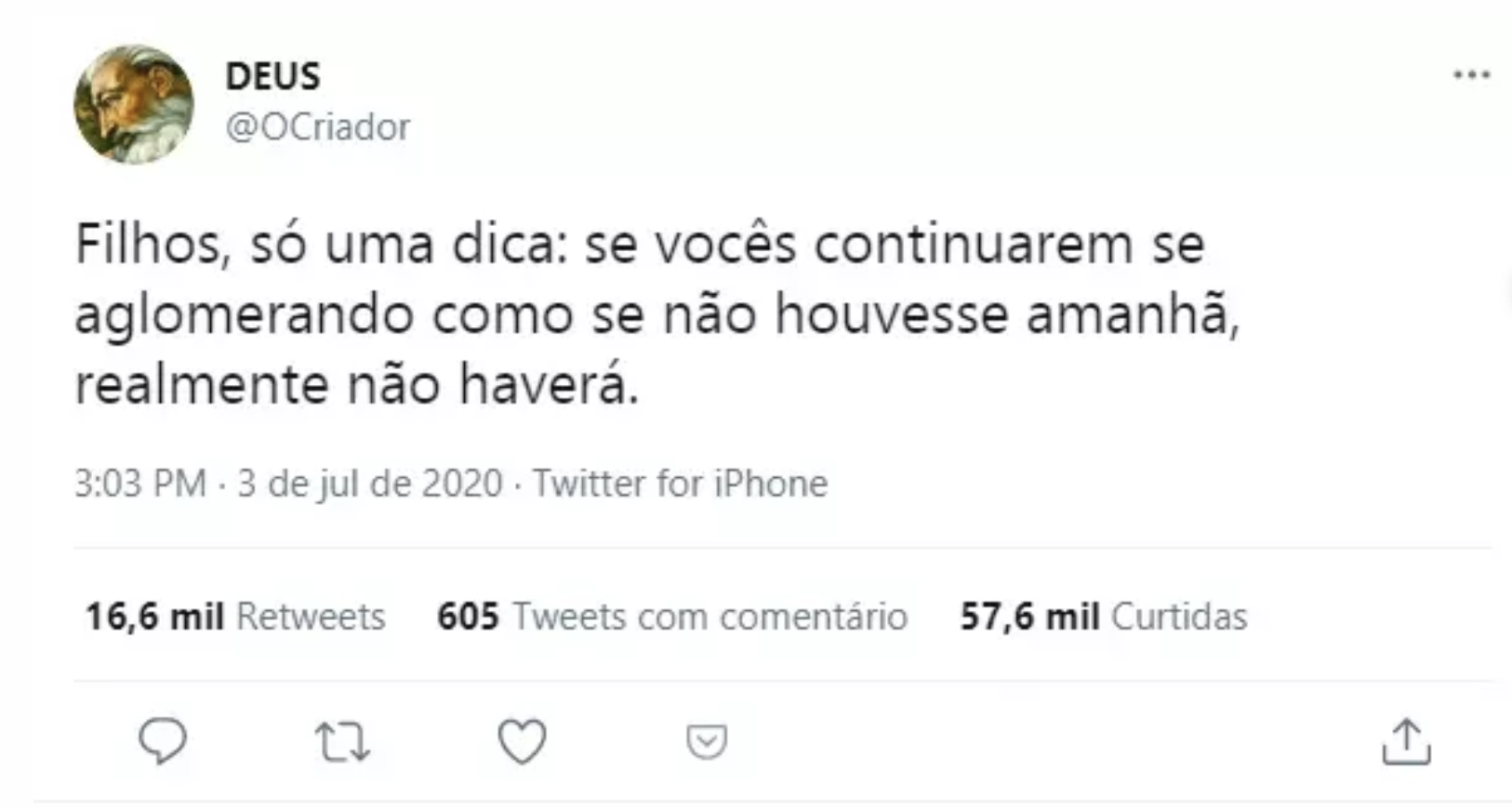 Supla, por exemplo, aproveitando a tendência, anunciou também a venda de imagens e animações exclusivas. Até Felipe Neto entrou na jogada: a Play9, empresa do influenciador, lançou a 9block, uma plataforma cujo objetivo é “democratizar a criação e comercialização de NFTs”. Alguns tweets tem feito sucesso: um norte-americano adquiriu o feito – por ninguém mais ninguém menos do que Deus – do perfil humorístico (@OCriador). O post traz um comentário sobre aglomerações durante a pandemia do novo coronavírus: