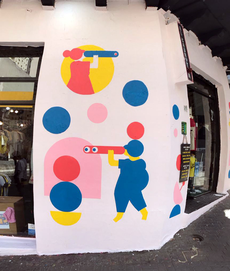 Agora, no mural da El Cabriton, estou fazendo o processo completo, desde a concepção da ideia até a execução, e percebo que uma das dificuldades é adaptar a técnica digital para a tinta e o pincel, assim como repassar uma arte em formato A3 para uma parede toda. É um desafio! Mas é muito satisfatório quando você começa a ver a imagem sendo formada nas paredes.