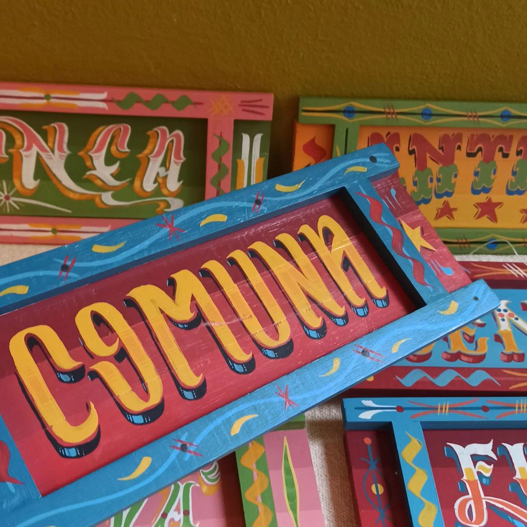 O processo de trabalho de Karina Kosugue começa na marcenaria. Ela dedica alguns dias para cortar e montar os painéis, geralmente usando madeira pinus ou de reuso. Depois, desenvolve a paleta de cores. Essas peças recebem uma pintura base conforme cada pedido. A partir daí, a artista dedica dias ao trabalho de pintura das letras e filetes.