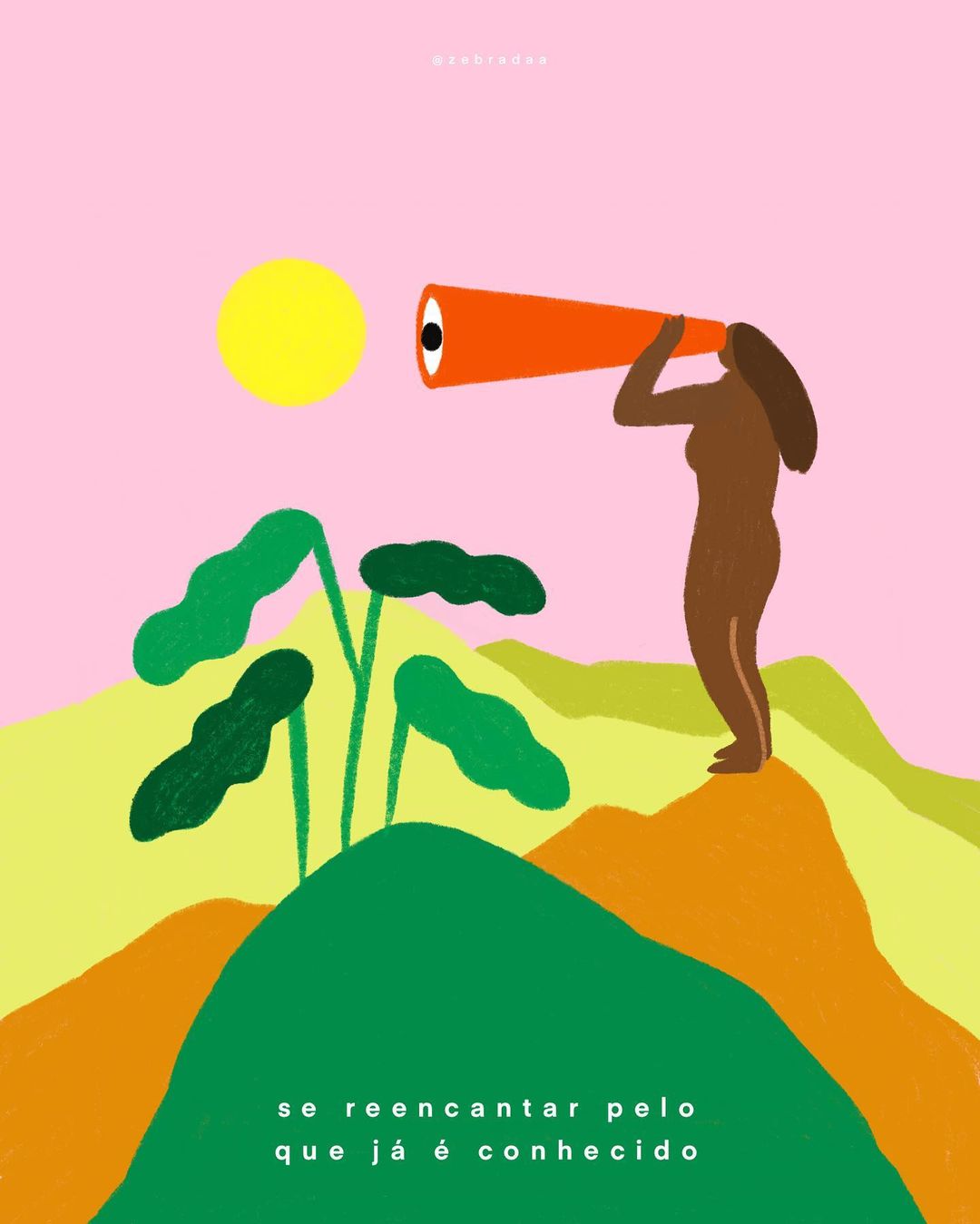 O trabalho de Fernanda Bornancin, a.k.a. Zebradaa, é como se fosse um respiro. Sua arte tem sido mais do que necessária para desafogar, em meio a tantas notícias ruins, inseguranças e informações que só trazem ansiedade. Como ela mesmo diz, bora “abraçar a viagem e reduzir o controle”.