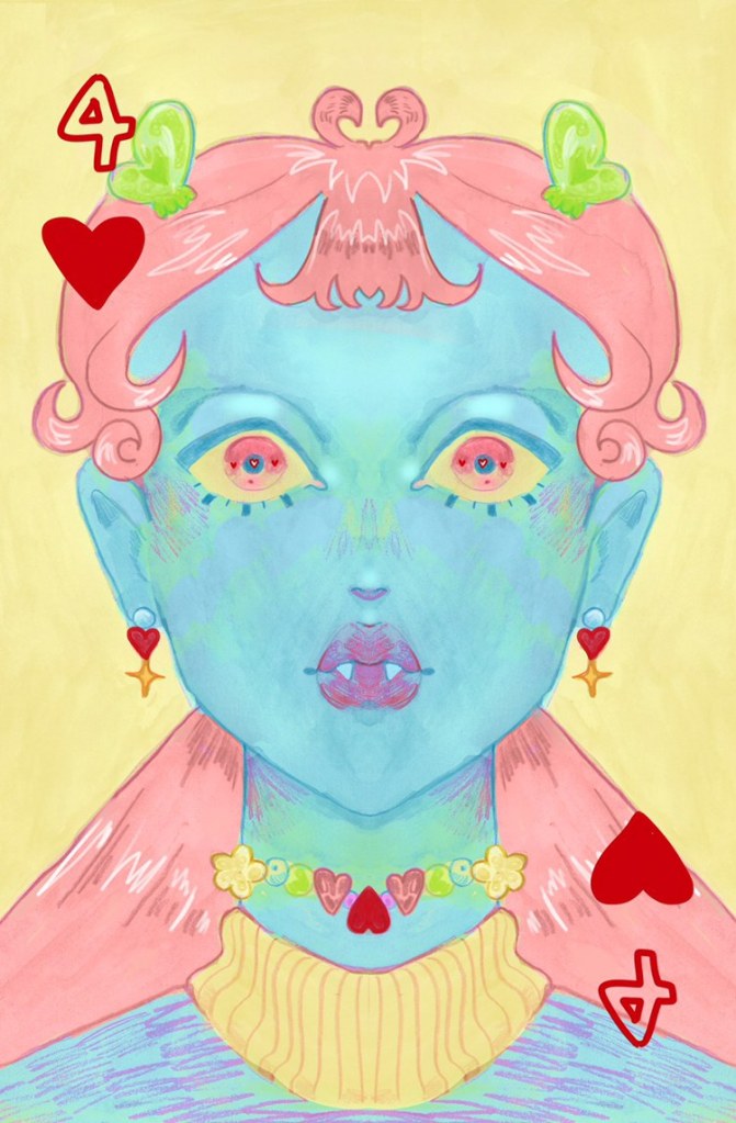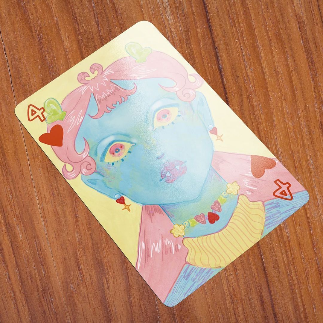 Pietra é a responsável pelo 4 de Copas. Assim como Pedro, a artista de 20 anos desenha desde cedo. Pietra começou a levar mais a sério a ideia de comercializar suas ilustrações durante a pandemia, após postar nas redes sociais suas criações com frequência e ver o retorno.