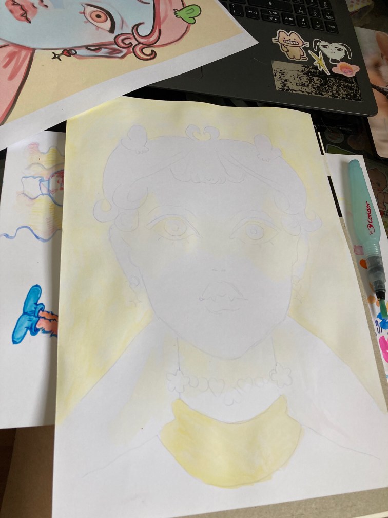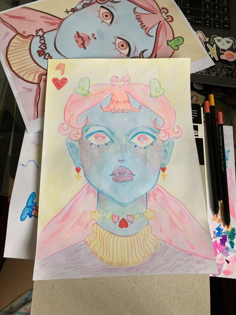 Sua arte é feita em mídia mista. Basicamente Pietra desenha em lápis, usa aquarela, para depois terminar a ideia no digital.
