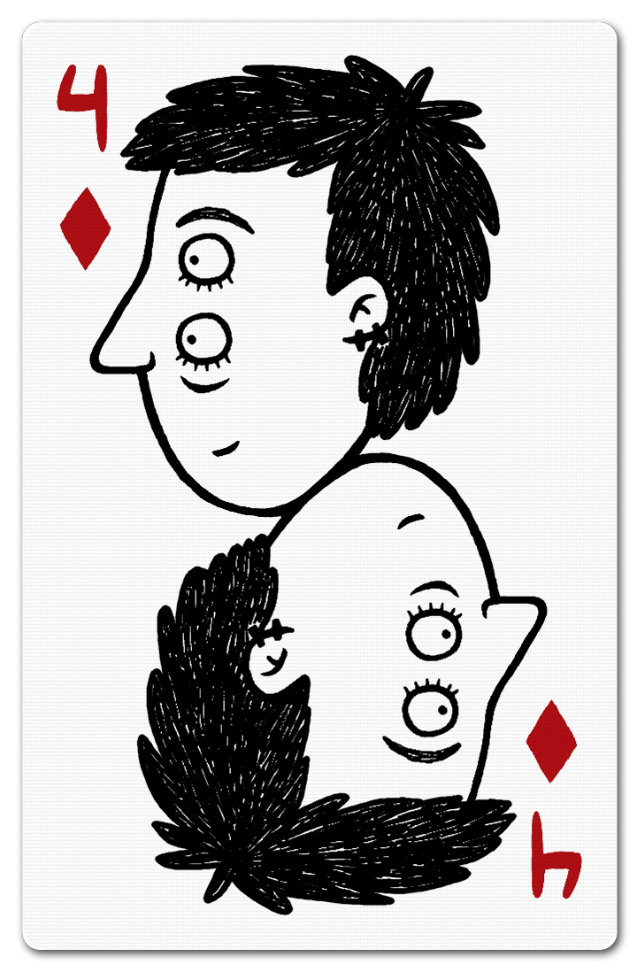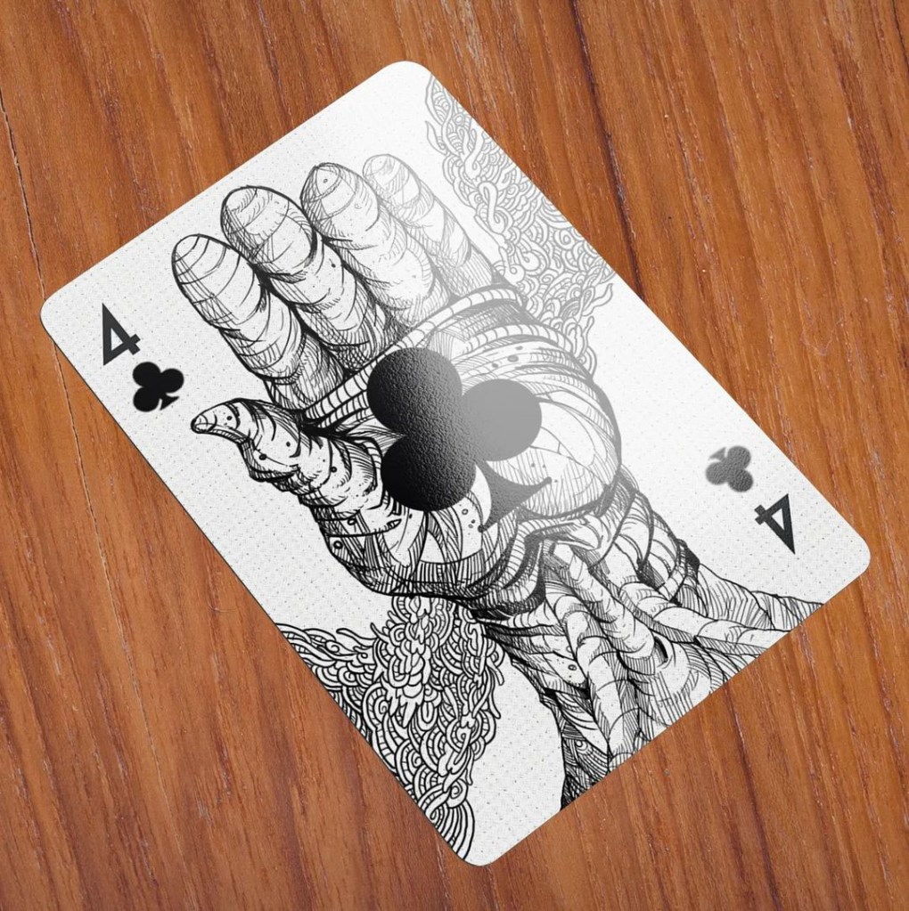 Para o 4 de Espadas, quis fazer uma homenagem ao instrumento que possibilita o desenhar e o jogar cartas, ou seja, às mãos. “Meu trabalho é muito corpórea, por isso fiz justamente a parte do corpo que usamos ao desenhar ou manipular as cartas do baralho”.