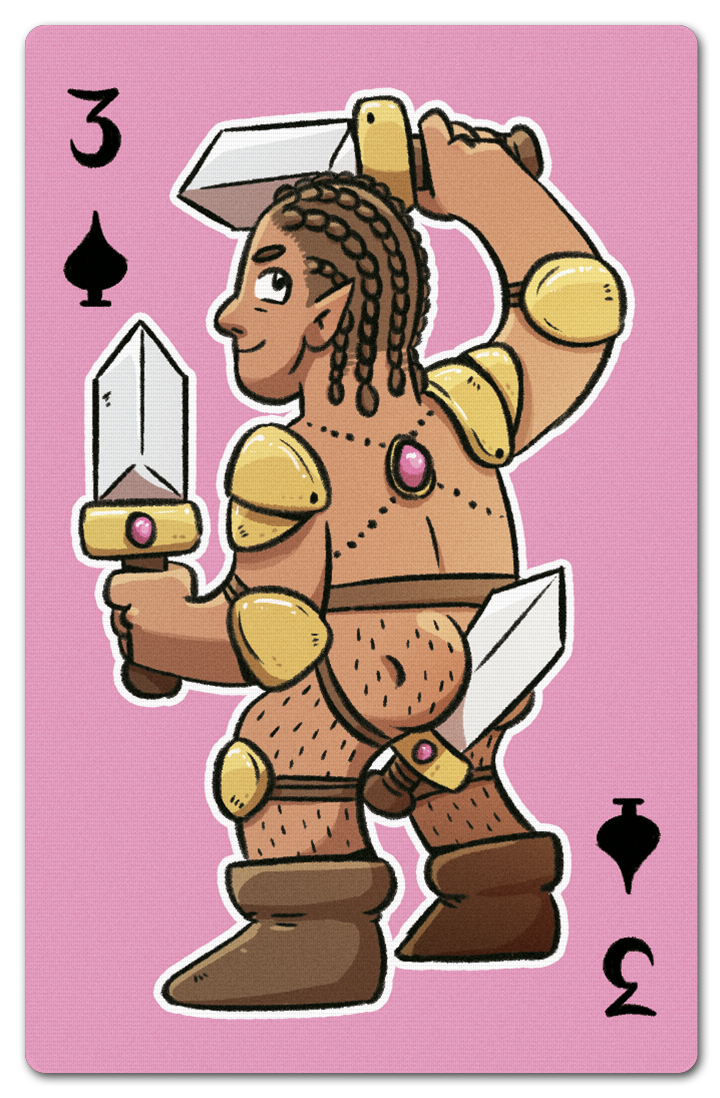 “Pedi ajuda e usei como modelo meu parceire Hinacio King e criei a ilustração com base em algumas fotos que tiramos, pensando também em como mostrar o número da carta de forma complementar ao meu tema”.