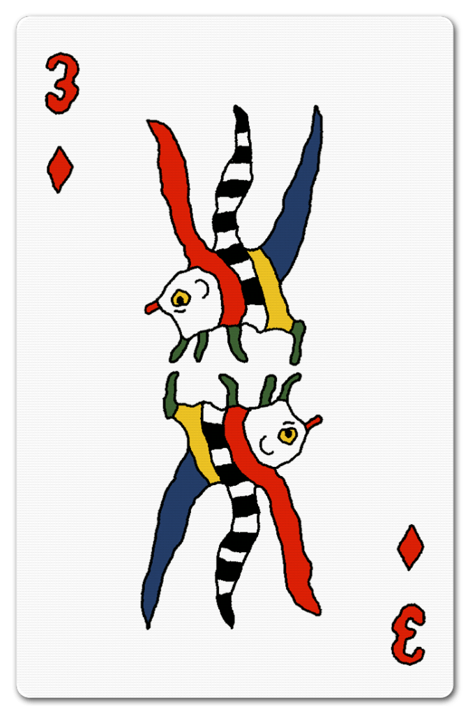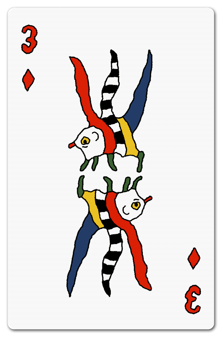 Para sua Carta 3 de Ouros, Raysa pensou em criar um personagem que representasse o próprio número 3. Deixou as linhas a conduzirem, ao invés de partir para algo com intenção estabelecida.