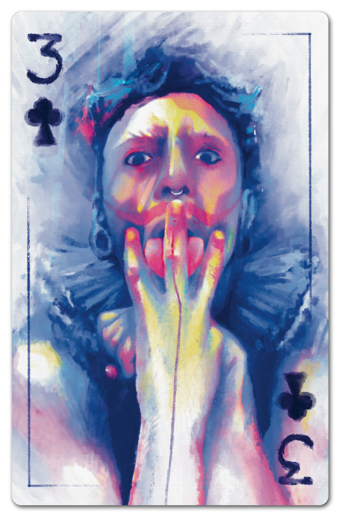 Fer Caju é tatuadore em eterno aprendizado, geminiano de múltipla personalidade e jovem-místico-parodista nas horas vagas. Para o 3 de Paus, quis brincar com o naipe e o próprio significado ambíguo da palavra, se inspirou na cultura Drag e na multiplicidade de gênero (tema que vive diariamente). Surgiu então, a figura (abaixo) que pode ser lida como um homem, mas na verdade é Drag King.