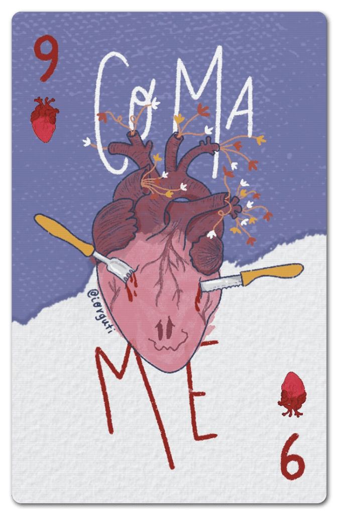Por falar em amor, sua carta para a El Cabriton é do naipe de copas. Nela, Guti desbrava sentimentos e brinca com o sentido das palavras. O universo das emoções, do afeto e o hand lettering refletem diretamente em seu sensível trabalho.