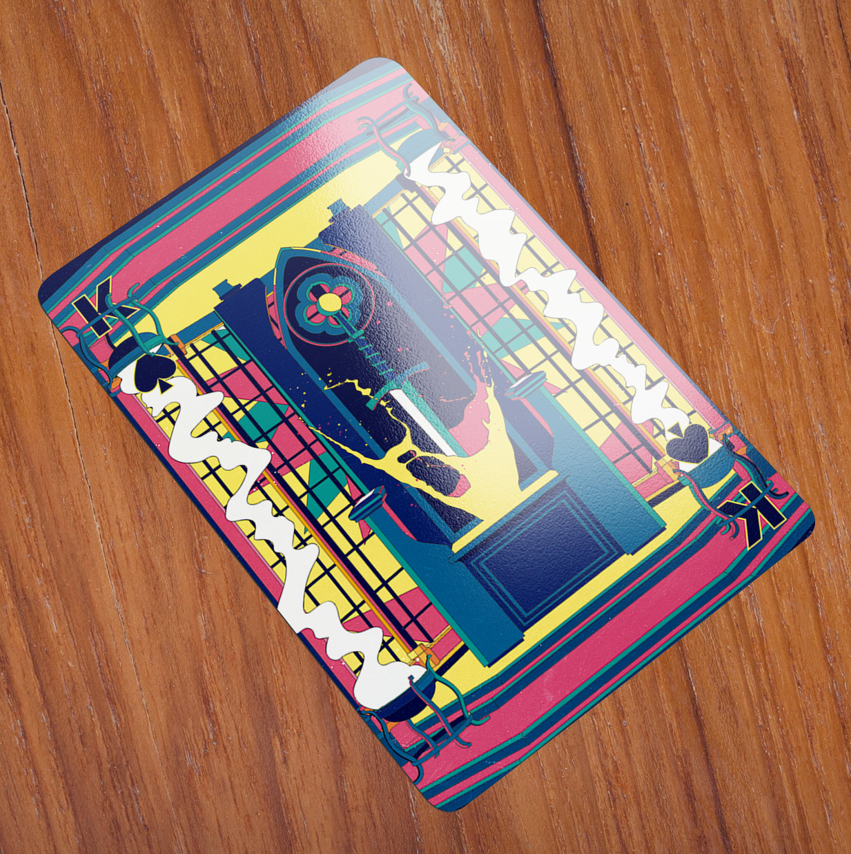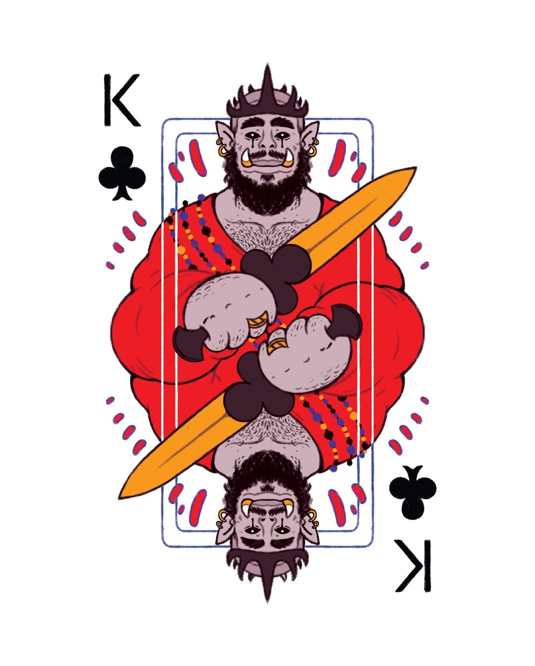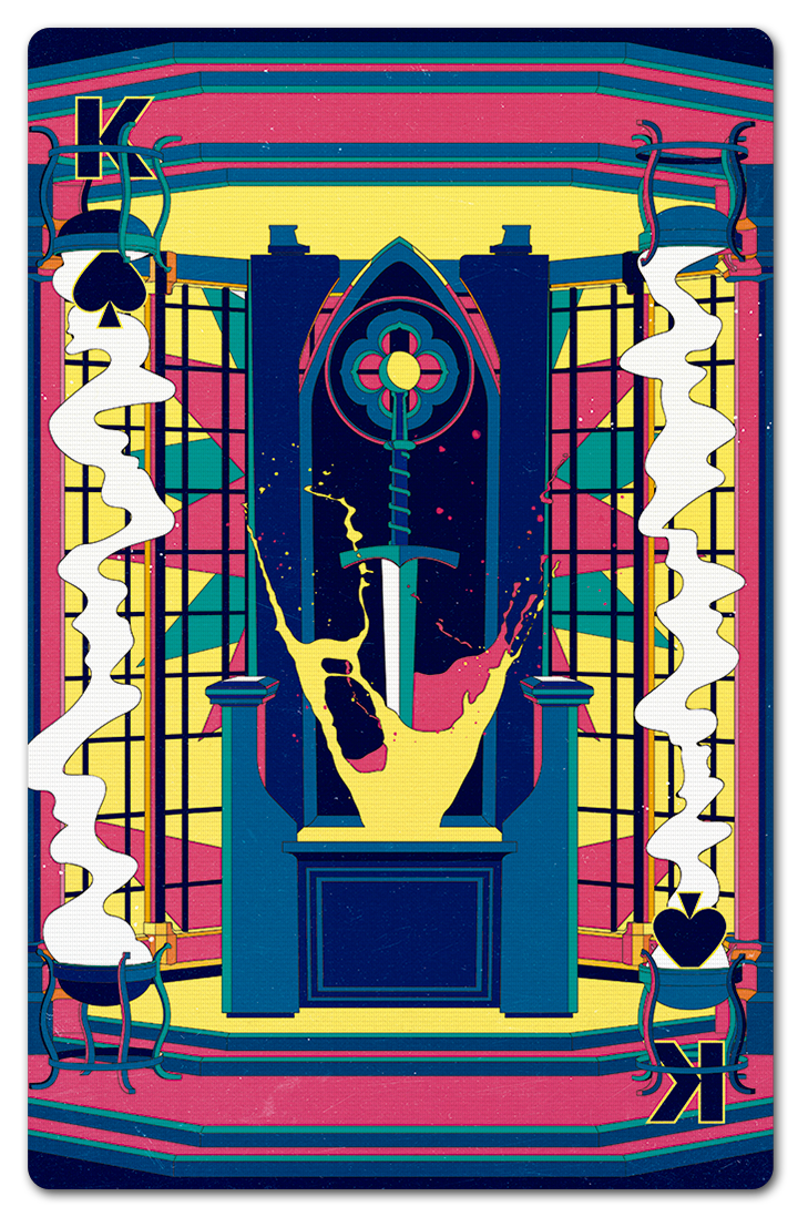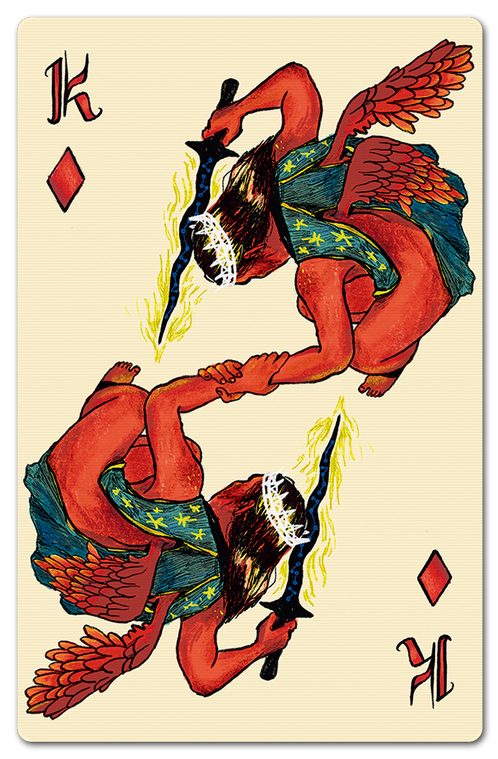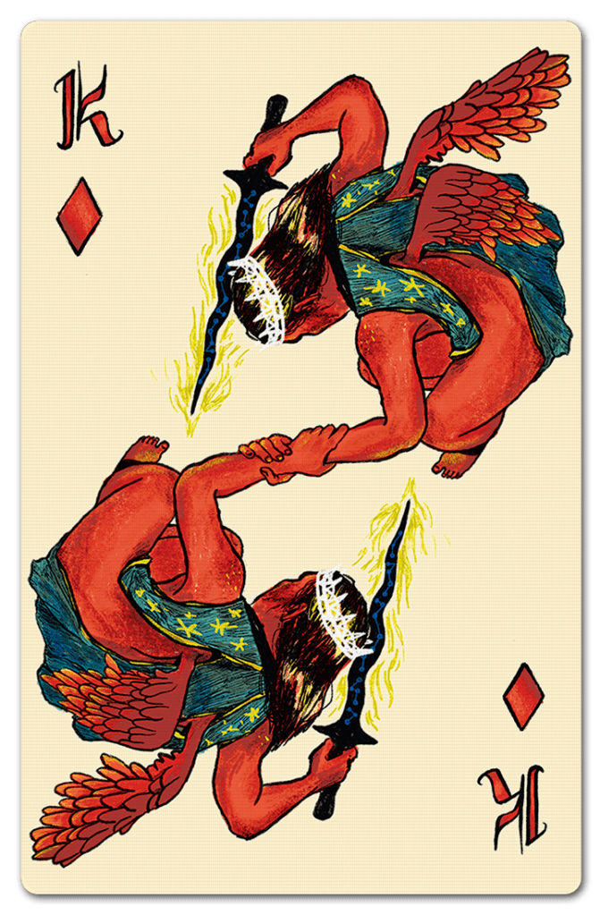 “Cartas como o Rei, o Valete, a Rainha, costumam ser espelhadas na vertical para terem um desenho que funcione, não importa como você a segure. Queria assumir o desafio e criar uma narrativa, foi daí que decidi criar dois personagens que interagem de forma espelhada pra sugerir um conflito interno; tanto a postura deles como a espada que eles carregam formam o losango do naipe da carta”.