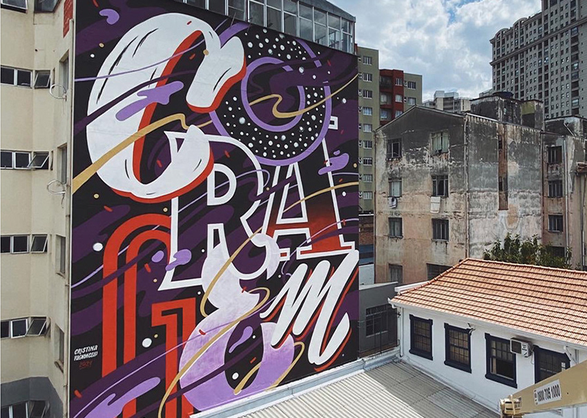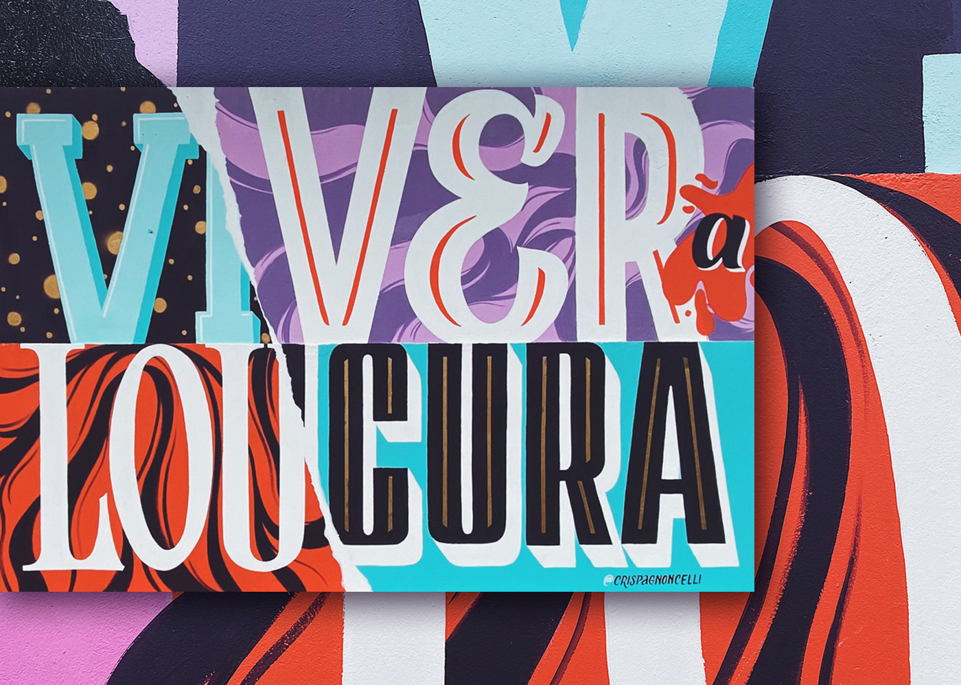 Cris: No momento tenho pintado bastante e pretendo seguir nessa linha. Murais e a pintura tem sido meu foco atual. E para além da técnica do lettering / desenho de letras, tenho buscado explorar novos visuais e composições.