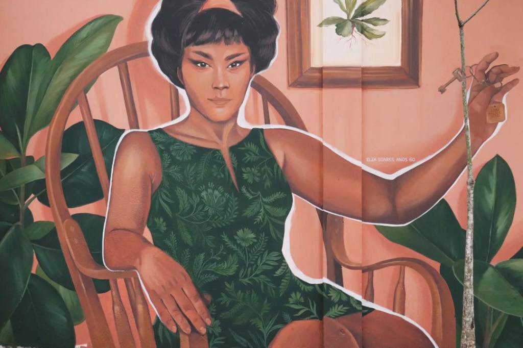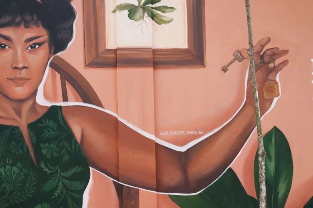 Elza Soares, uma das maiores cantoras do Brasil, hoje estampa em cores quentes e tons pastel o muro ao lado da entrada do estabelecimento. A pintura, feita pela incrível ilustradora paulistana Pri Barbosa, traz a artista segurando uma chave. Ao lado de sua mão, a frase “Nenhuma mulher sem casa”.