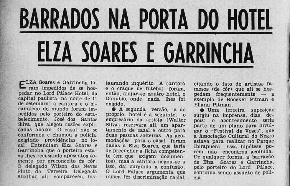Em 11 de setembro de 1964, Elza Soares foi barrada na porta do Hotel Lord, ao lado de Mané Garrincha. Os dois procuravam um lugar para se hospedar antes do show da cantora que aconteceria na boate Som de Cristal.