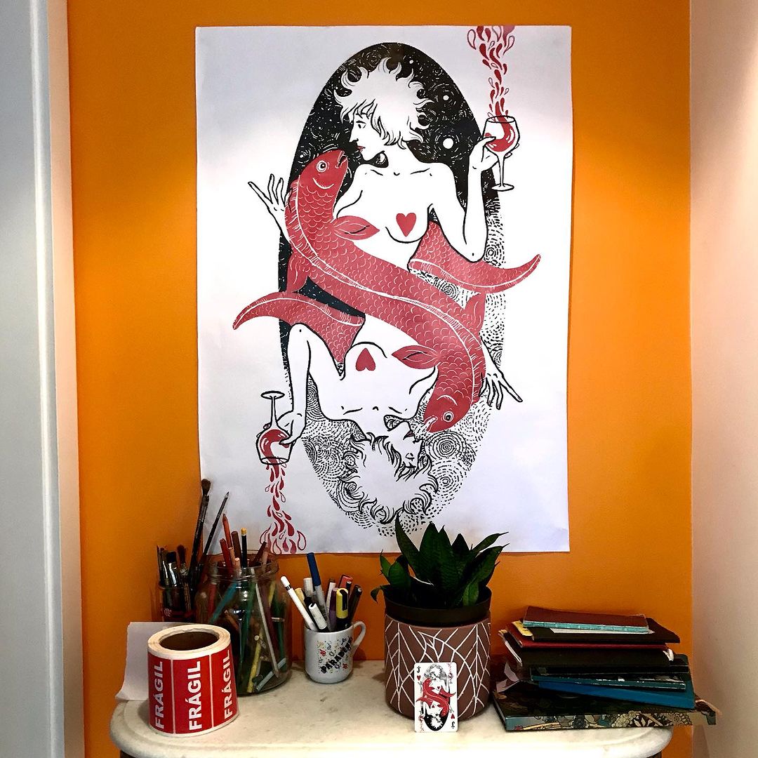 Artista plástica franco-brasileira, Johanna desenha para jornais, revistas e editoras. Seu lambe, J de Copas, traz a arte autoral que criou especialmente para a 13ª edição do baralho El Cabriton, Projeto 54, inspirado em uma conversa aleatória que teve com um amigo sobre astrologia.