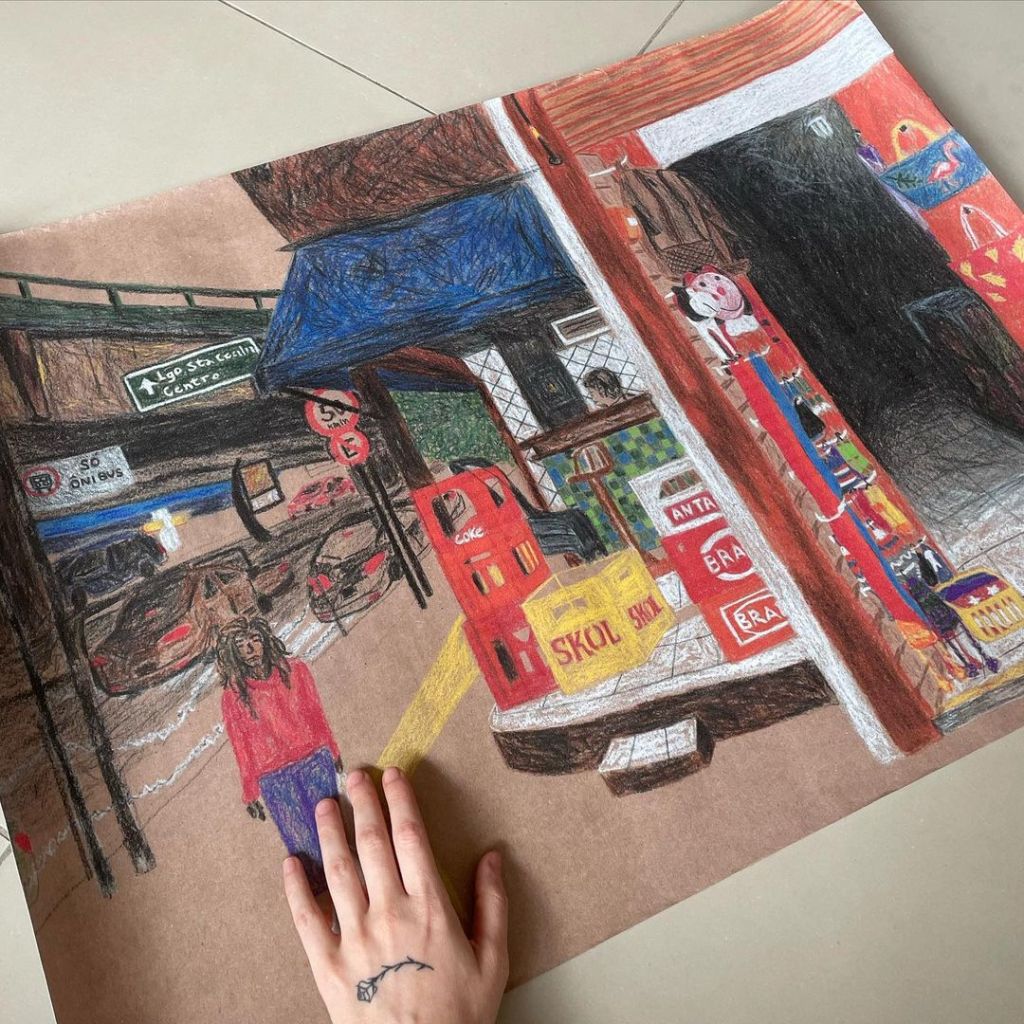 Através do desenho, Bruna vivencia a cidade, suas camadas e diálogos. Para o lambe da El Cabriton, a artista retratou em papel kraft e lápis de cor, a ‘esquina minhocão’.