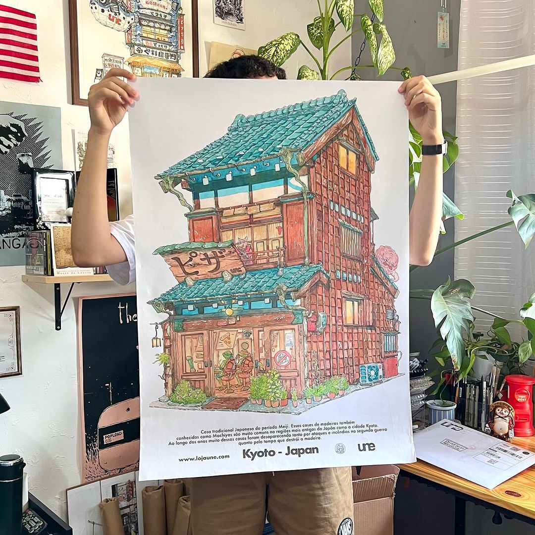 Hoje, sua arte em aquarela tem o poder de apresentar a cultura japonesa à outras pessoas. Seu lambe: Pizzaria Meiji.