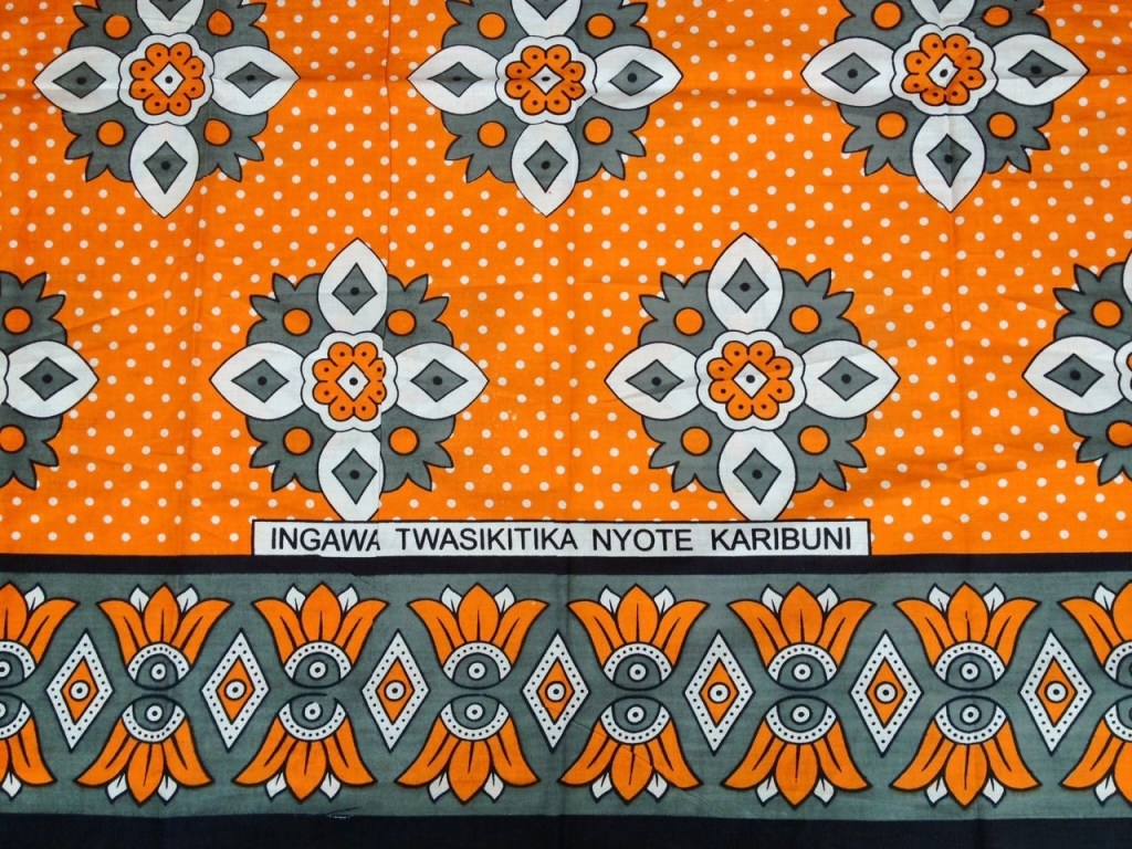 Imagem por Dar es Salaam (Tanzânia), vendedor de cangas, 2011. O texto em suaíli: Usijaze masusu kwa mambo yasokusuhu significa “Não se envolva em assuntos que não lhe dizem respeito”, via Wikipedia;Ditados, aforismos e slogans que favoreciam a liberdade começaram a ser estrategicamente colocados na borda do tecido. “Mesmo estando tristes, sejam todos bem-vindos”. Via: Thee Towah Group 2020;